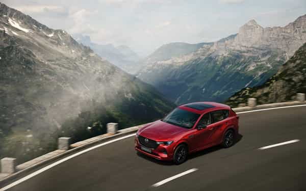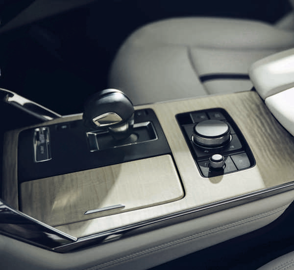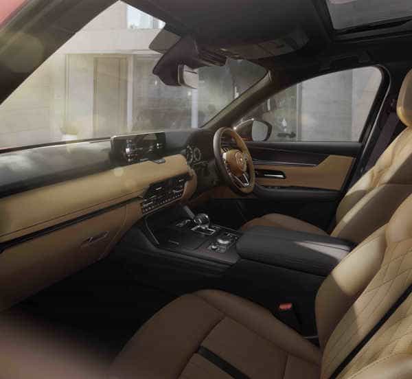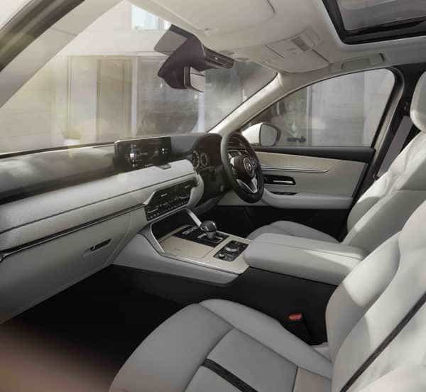 The CX-60 features a panoramic roof that offers a wide field of view and brings plenty of light into the cabin. The 950 mm (W) x 1,021 mm (L) panoramic roof and its peripheral parts were meticulously designed to allocate as much surface area to the window as possible to increase the field of view and light range for passengers in the rear seats.